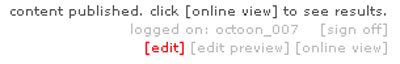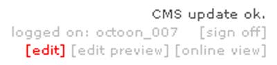 Rechts oben erscheinen allgemeine CMS-Informationen, wie zB der momentan angemeldete user, der [sign off]-Link, generelle Systemstatusmeldungen sowie Umschalter für die drei verfügbaren Ansichtsmodi innerhalb des CMS-Systems:
