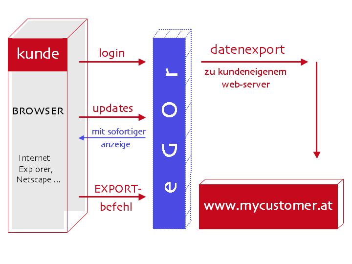 Die CMS ArchitekturGrundsätzlich handelt es sich bei octoon.com's CMS (Content Management System) um ein Dienstleistungssystem. Unsere CMS-Software ist aufgrund eines "shared hosting systems" immer up2date: d.h. CMS-Server und kundenspezifischer Web-Server sind getrennt. der kundenseitige Web-Server wird durch den laufenden Export statischer HTML-Seiten aus dem CMS-System am letzten Stand gehalten. Dies bedeutet einen großen Performance-Gewinn, da keine weiteren Datenbankzugriffe mehr nötig sind! Die eGOr CMS-Editionen eignen sich somit für alle Informationsträger,
