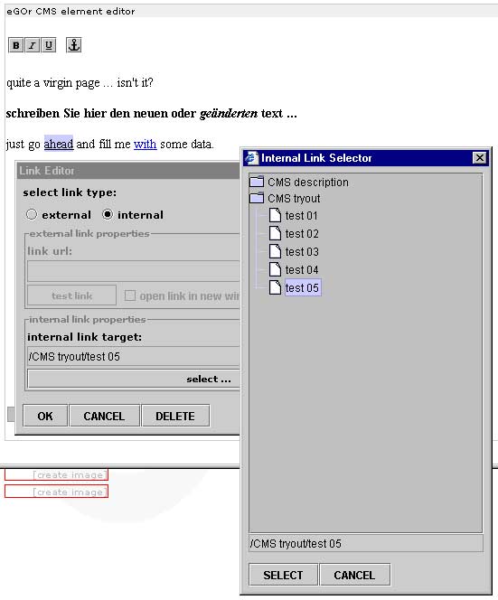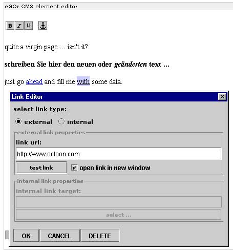 Bestätigen Sie im Link Editor-Fenster mit OK und anschließend im Text-Editor mit update CMS (siehe Text-Editor). Mittels DELETE können Sie erstellte Links löschen. Die gewählten Links sind damit aktiviert. |